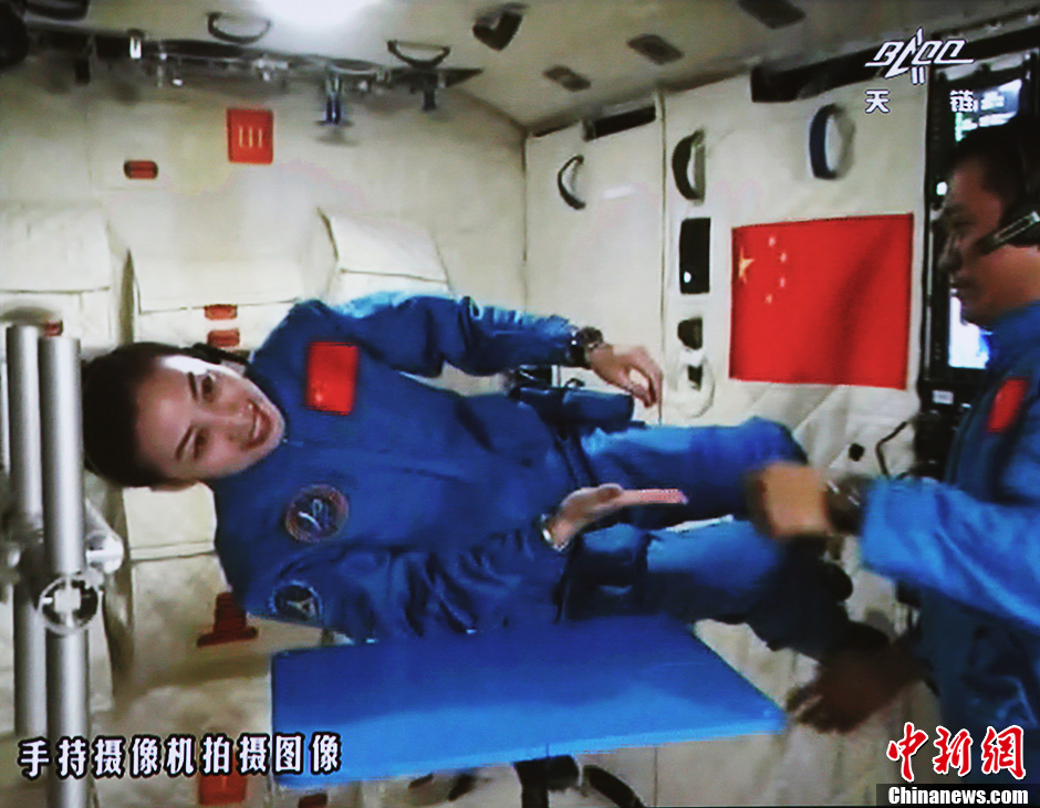 6月20日10时许,神舟十号航天员在天宫一号开展基础物理实验,为青少年进行中国首次太空授课。图为王亚平讲授太空失重提供条件下的方位感演示。中新社发 秦宪安 摄
