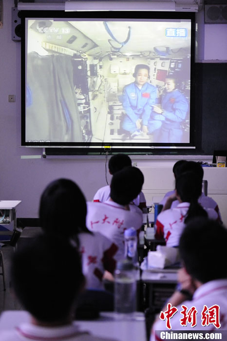 6月20日上午10时许,北京人大附中的一间教室内,学生们观看神舟十号航天员进行中国首次太空授课。图为学生们观看航天员聂海胜演示“悬空打坐”。中新社发 崔楠 摄