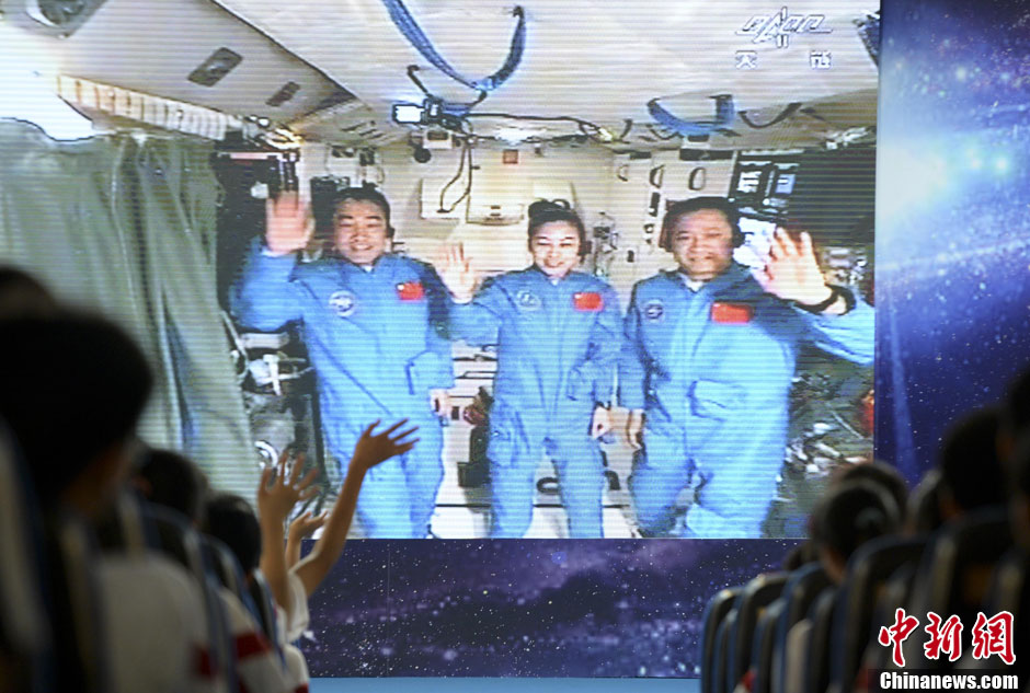 6月20日10时许,神舟十号航天员在天宫一号开展基础物理实验,为青少年进行中国首次太空授课。中国8万余所中学6000余万名师生同步收听收看。图为神十航天员与北京人大附中学生互动。廖攀 摄
