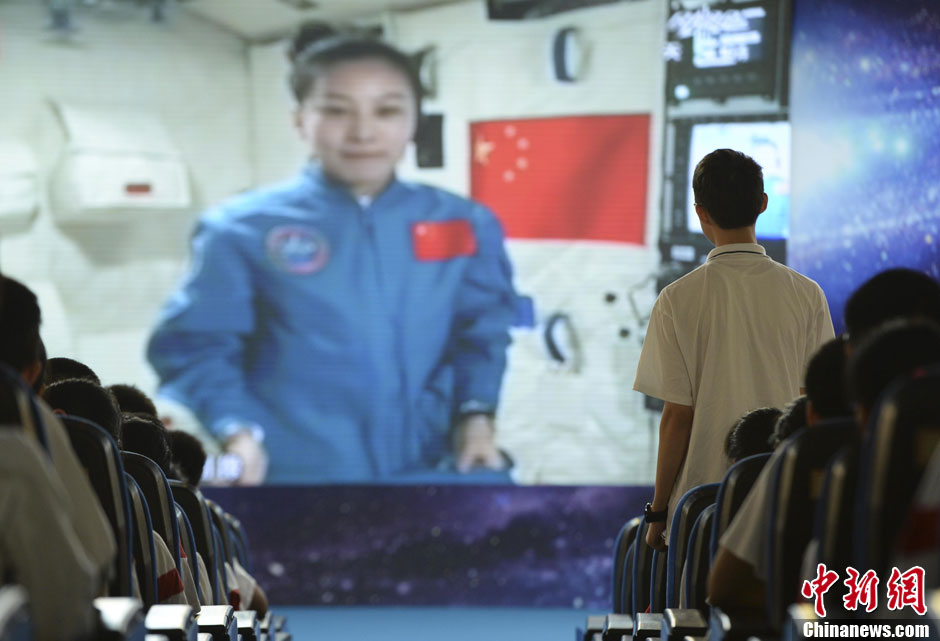 6月20日10时许,神舟十号航天员在天宫一号开展基础物理实验,为青少年进行中国首次太空授课。中国8万余所中学6000余万名师生同步收听收看。图为北京人大附中学生向神十航天员王亚平提问。廖攀 摄