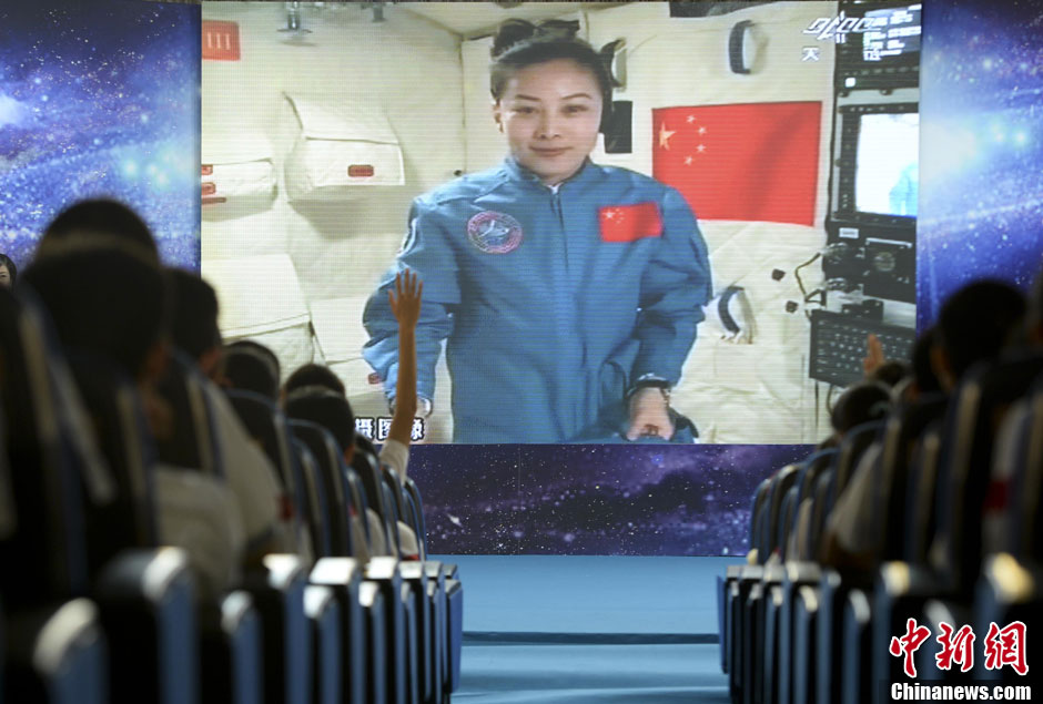 6月20日10时许,神舟十号航天员在天宫一号开展基础物理实验,为青少年进行中国首次太空授课。中国8万余所中学6000余万名师生同步收听收看。图为北京人大附中学生争相向神十航天员王亚平提问。廖攀 摄