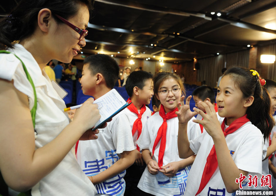 6月20日,在中国首次太空授课结束后,媒体记者采访授课过程中曾试图举手提问的北京史家胡同小学学生李木子。中新社发 崔楠 摄