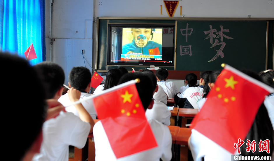 6月20日,济南历城三中学生收看山东老乡王亚平的太空授课。当日,神舟十号航天员进行中国首次太空授课,中国首位“太空老师”王亚平成为家乡学子心目中偶像,激发了山东学子们探究物理奥妙的兴趣,激励学生追寻“中国梦”。中新社发 张勇 摄