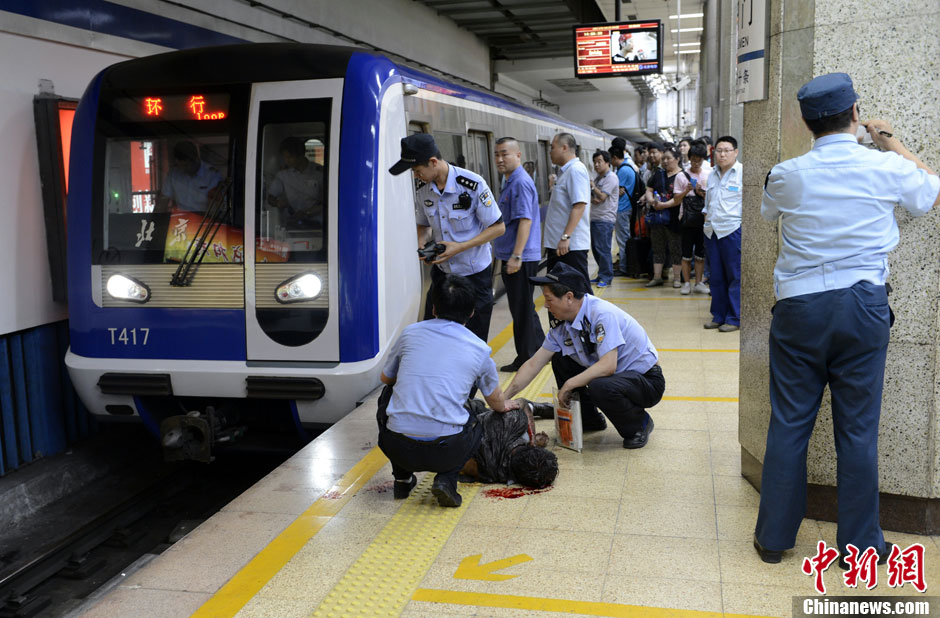6月20日13时46分,在北京地铁2号线朝阳门站外环方向进站处,一名乘客掉下站台,2150次(417)列车紧急停车。该男子随后被警察和地铁工作人员救起,具体情况不明。中新社发 刘震 摄