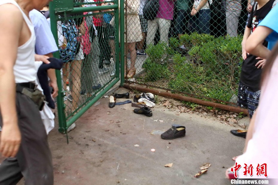 2013年6月20日,2013年贝克汉姆六月中国行上海站,小贝造访同济大学被万千球迷簇拥,贴身保镖紧急开道。据央视报道,小贝到访同济大学,现场观众“疯狂”,引发踩踏事故,目前至少造成五人受伤。图为现场散落的鞋子。图片来源:Osports全体育图片社
