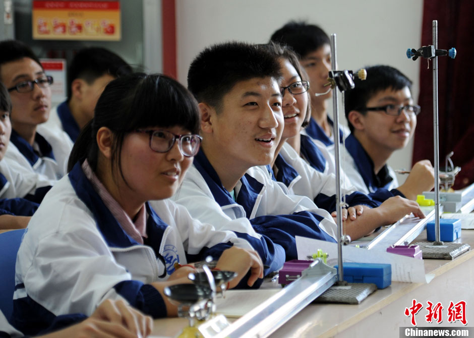 6月20日,“神舟十号”女航天员王亚平家乡母校烟台福山一中的数百名老师学生通过电视直播收看太空授课。烟台福山一中礼堂内,同学们聚精会神听讲,精彩的陀螺演示、水球实验等博得了同学们一阵阵喝彩声。中新社发 王娇妮 摄