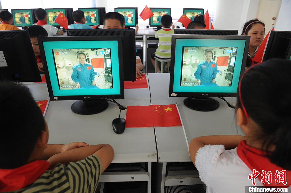 6月20日,安徽合肥屯溪路小学阳光校区的小学生们观看中国首次太空授课。当日上午10时许,神舟十号航天员在天宫一号开展基础物理实验,为全国青少年进行太空授课。中新社发 张娅子 摄