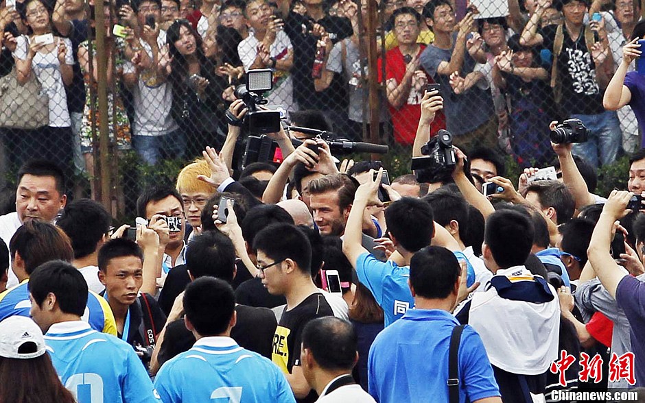 6月20日,贝克汉姆到访同济大学,不少人员爬到楼顶观看,或是翻窗进入球场,现场秩序一度失控引发踩踏情况,至少造成5人受伤。中新社发