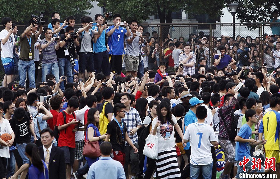 6月20日,贝克汉姆到访同济大学,不少人员爬到楼顶观看,或是翻窗进入球场,现场秩序一度失控引发踩踏情况,至少造成5人受伤。中新社发