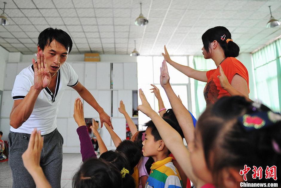 6月20日,昆明盲哑学校内,小学组和初中组的聋哑学生正在上舞蹈课,课堂里没有声音,只有简单的手语和不断重复的舞蹈动作。为了参加云南省残疾人文艺汇演,他们加紧了教学时间,希望能在比赛上取得好成绩。图为老师用手语教学生舞蹈。中新社发 任东 摄
