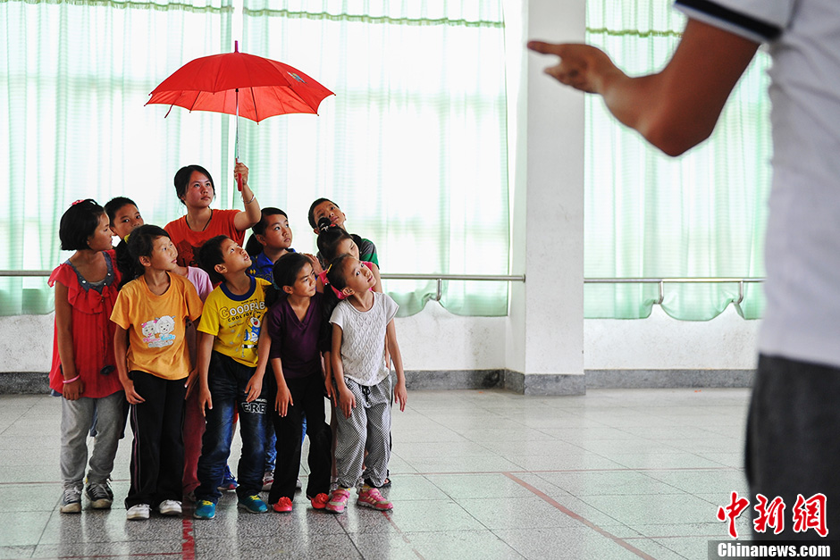 6月20日,昆明盲哑学校内,小学组和初中组的聋哑学生正在上舞蹈课,课堂里没有声音,只有简单的手语和不断重复的舞蹈动作。为了参加云南省残疾人文艺汇演,他们加紧了教学时间,希望能在比赛上取得好成绩。图为老师用手语教学生舞蹈。中新社发 任东 摄