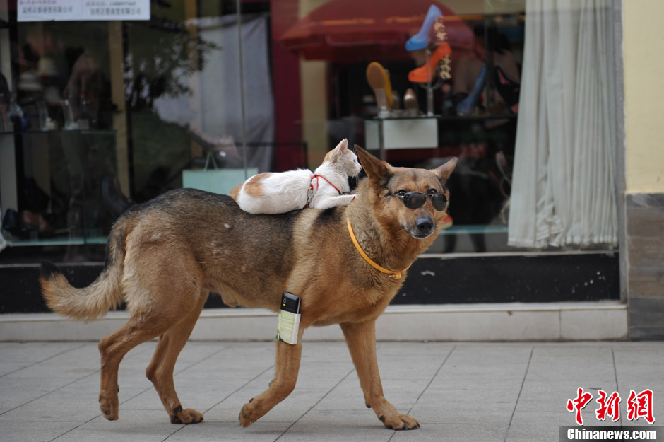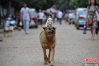 6月23日,昆明市民徐先生饲养的小猫和昆明犬在街头散步,小猫威风凛凛的骑在狗的背上,让不少路过的市民啧啧称奇。中新社发 刘冉阳 摄