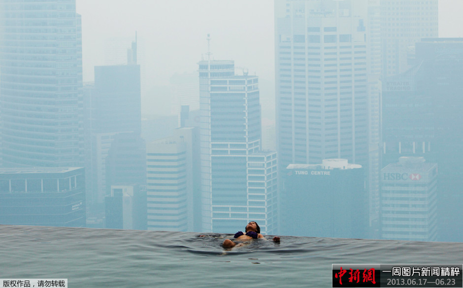当地时间6月17日,新加坡,一名女子在滨海湾酒店的顶层游泳池游泳。近日,严重的雾霾侵袭新加坡。据新加坡媒体报道,雾霾源自印尼苏门答腊的农民和油棕园主烧芭蕉林,烟尘一路飘到新加坡。
