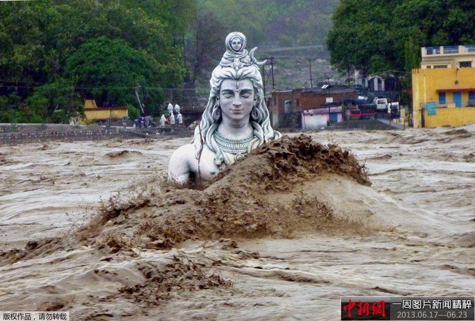 6月17日,印度瑞诗凯诗,恒河暴涨的洪水将一尊印度湿婆雕像淹没。近日,印度北部季节性的洪水造成大量山体滑坡,死伤人数持续上升。