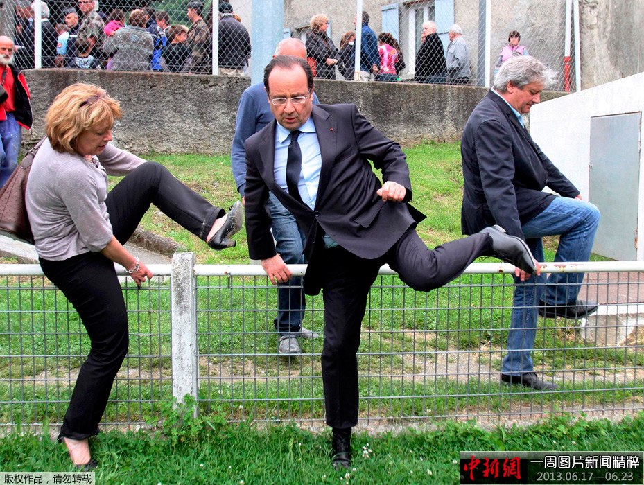 6月20日,法国总统奥朗德视察法国南部洪水灾区时,翻过栏杆。洪水造成法国南部Luz-Saint-Sauveur地区三人死亡,一座大教堂被迫关闭。