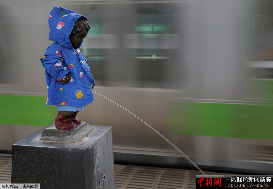 6月18日,日本东京地铁内,当地标志性雕塑撒尿男孩穿上了“雨衣”。