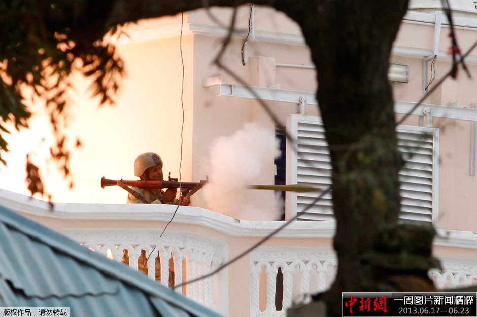 6月19日,位于索马里首都的联合国大楼的门外,七名与基地组织有联系的武装人员引爆了一辆安装了爆炸物的皮卡。图为一名士兵用肩扛式火箭弹予以还击。