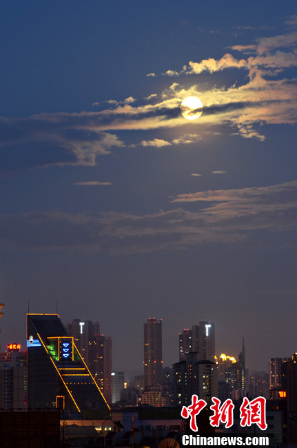 6月23日,“超级月亮”挂福州夜空。当日,正好是农历十六日,据天文部门预测,23日19时11分,月球过近地点,距地球35.699万公里,大约19时30分左右,月亮又迎来月圆时刻,这便是2013年最大最圆的月亮,也就是“超级月亮”。中新社发 郑祚声 摄