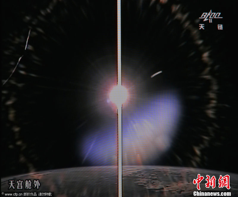 图为从天宫一号和神舟十号看到的太空奇异眩光。(视频截图)图片来源:CFP视觉中国