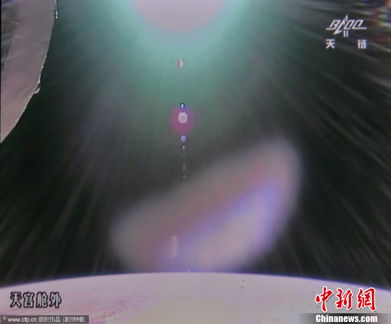 图为从天宫一号和神舟十号看到的太空奇异眩光。(视频截图)图片来源:CFP视觉中国