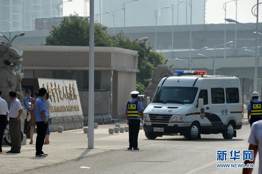 6月25日,押有罪犯王书金的警车驶进邯郸市中级人民法院。当日上午9时,王书金强奸杀人案在河北省邯郸市中级人民法院开庭。由于此案曾牵扯出19年前聂树斌案“一案两凶”的疑云,因此备受舆论关注。 2005年1月,河北省广平县人王书金在河南被警方抓获,他供述曾强奸多名妇女并杀死4人,其中包括一起“1994年石家庄西郊玉米地奸杀案”,而这起案件原本早已被石家庄警方侦破,“凶手”聂树斌已于1995年被石家庄市中级人民法院以强奸罪和故意杀人罪执行死刑。新华社发 朱旭东 摄 图片来源:新华网