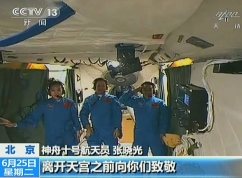 北京时间6月25日,在撤离天宫一号前,神十3名航天员聂海胜、张晓光、王亚平通过语音和手语向地面的科技人员和关心支持航天事业的人们表示感谢和敬意。(视频截图)