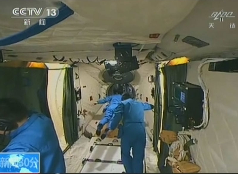 北京时间6月25日,在撤离天宫一号前,神十3名航天员聂海胜、张晓光、王亚平通过语音和手语向地面的科技人员和关心支持航天事业的人们表示感谢和敬意。(视频截图)