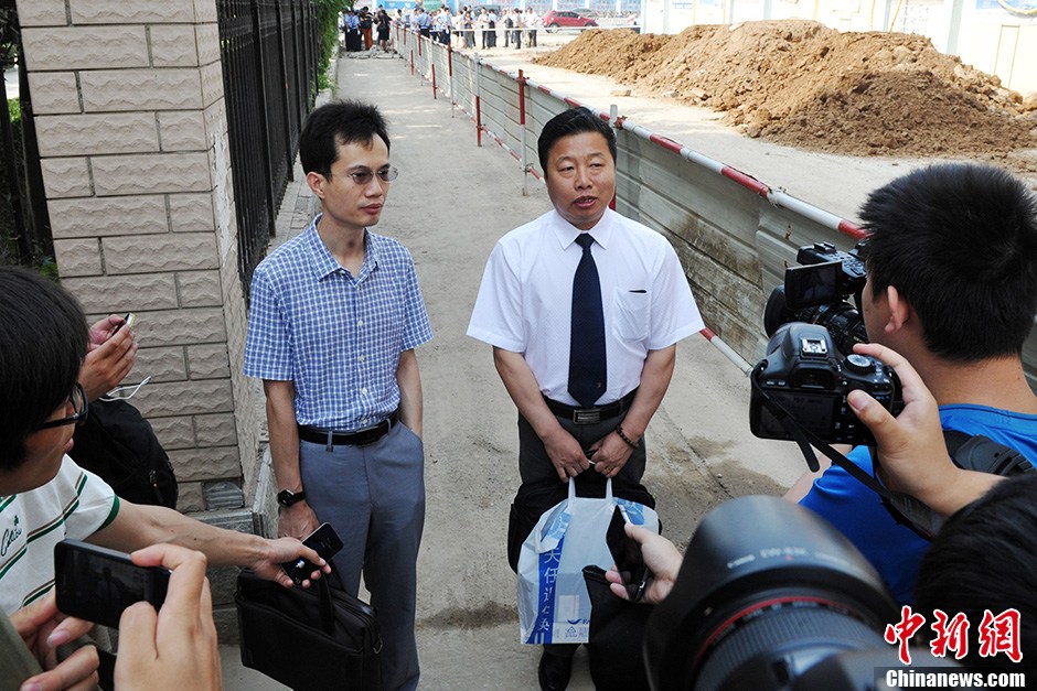6月25日上午,河北省高级人民法院在邯郸市中级人民法院开庭审理上诉人王书金强奸、故意杀人一案。这起案件因与聂树斌案有密切关系而备受关注。1994年,河北省石家庄市西郊发生一起强奸杀人案,聂树斌被指控为嫌犯,并于次年被执行死刑。2005年,河南警方抓获一名叫王书金的男子,他承认自己是“聂树斌案”的真凶。图为王书金的律师朱爱民(白衣)被媒体围堵。中新社发 翟羽佳 摄