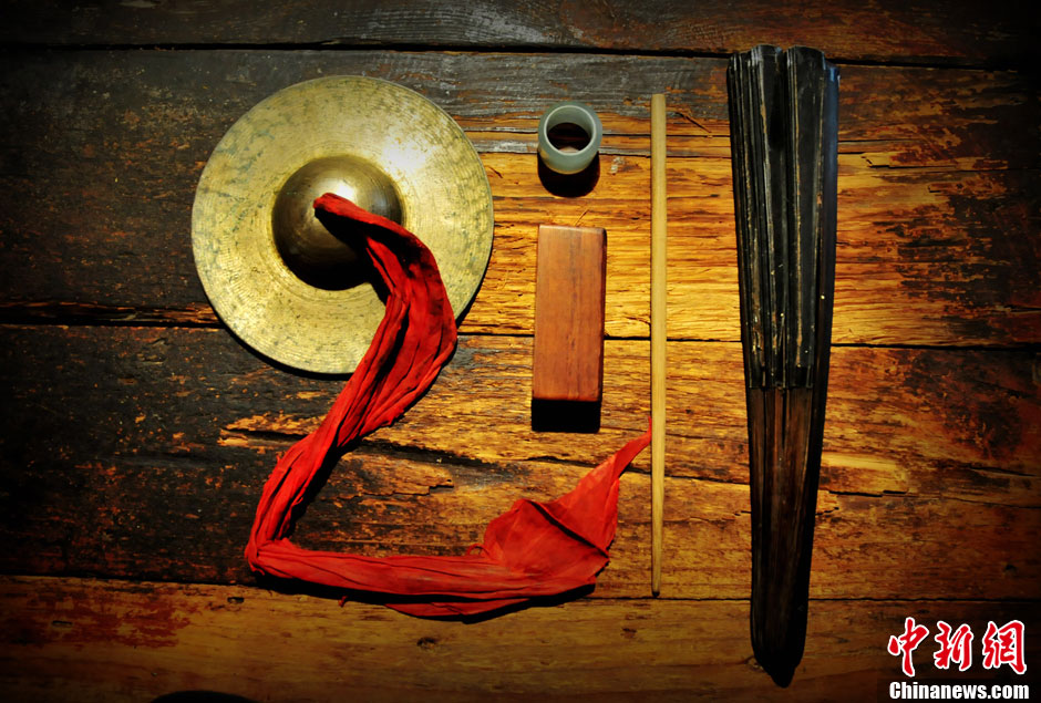 一张高台,半副铙钹、一块醒木,配以扳指、竹箸,就是福州评话艺人的装备。张斌 摄