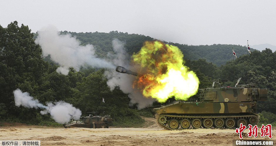 当地时间6月25日,韩国陆军在位于首尔以北约65公里的涟川训练场内举行实弹射击演习。图为韩国K55 A1自行榴弹炮在进行射击训练。