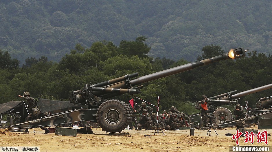 当地时间6月25日,韩国陆军在位于首尔以北约65公里的涟川训练场内举行实弹射击演习。图为韩国155毫米榴弹炮在进行射击训练。