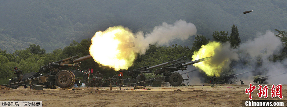当地时间6月25日,韩国陆军在位于首尔以北约65公里的涟川训练场内举行实弹射击演习。图为韩国155毫米榴弹炮在进行射击训练。