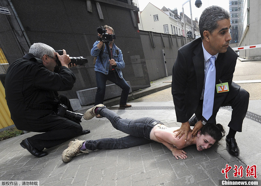 当地时间6月25日,比利时布鲁塞尔女权组织成员半裸身体,跳上突尼斯总理阿里的汽车。此次抗议活动是抗议突尼斯法庭判其同伴裸体抗议有罪。
