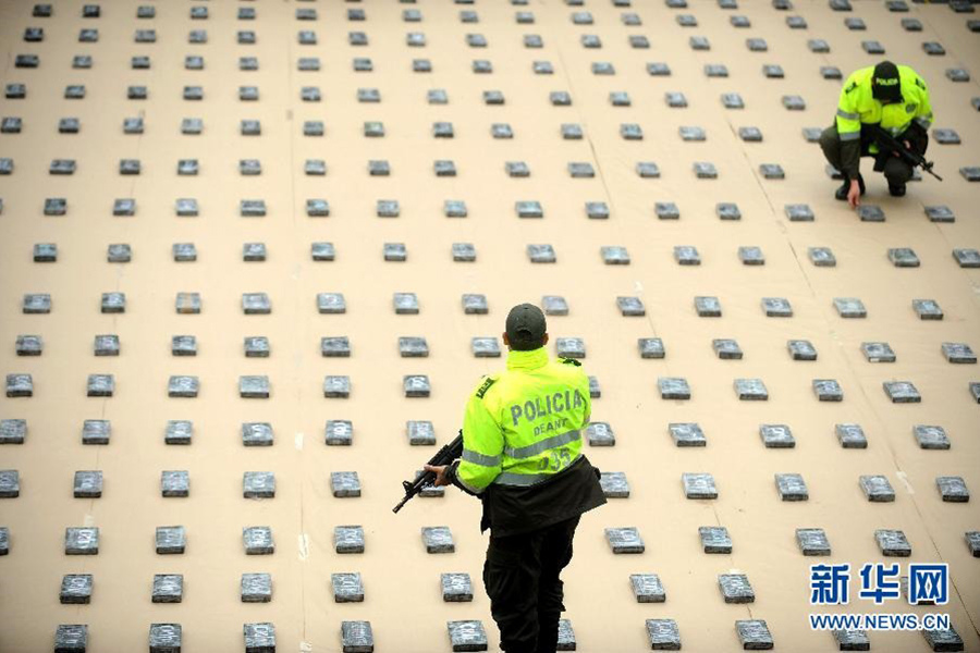 图为2011年6月27日,在哥伦比亚安蒂奥基亚省麦德林市警局,警察整理缴获的可卡因。 图片来源:新华网