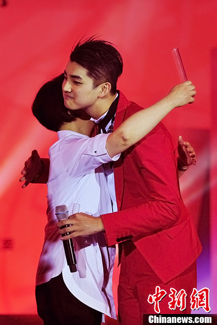 2013年6月25日,上海复旦大学在校内举行2013届毕业生晚会,与往年不同的是,今年的毕业晚会特别增设红毯入场仪式,才子佳人们各个精心打扮闪亮登场。图为学生与老师深情拥抱。图片来源:东方IC 版权作品 请勿转载