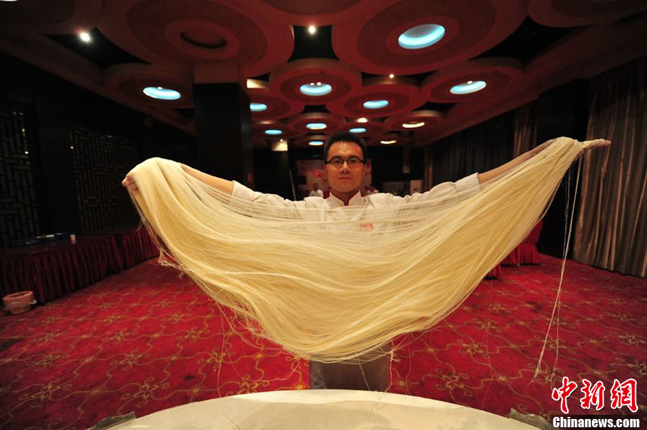2011年4月18日,太原,舞蹈专业的大学毕业生范波正在展示自己刚学的面艺——拉龙须面。图片来源:CFP视觉中国