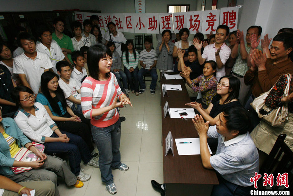 2008年5月4日,重庆经开区翠渝路社区,西政大学生正回答居民提出的问题。当日是五四青年节,渝北区翠云街道翠渝路社区抛出10名社区助理岗位,虽然没有任何报酬,但仍吸引来100余名西南政法大学的学生参与竞聘,由居民当考官进行选拔。钟志兵 摄 图片来源:CFP视觉中国