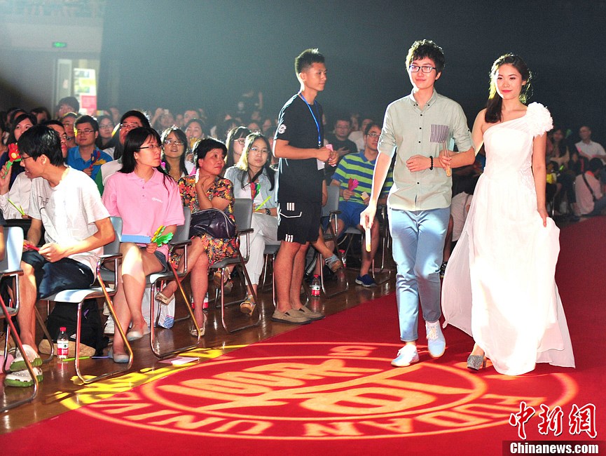 6月25日,上海复旦大学在校体育馆内举行2013届毕业生晚会,与往年不同的是,今年的毕业晚会特别增设红毯入场仪式,才子佳人们各个精心打扮闪亮登场。走红毯的嘉宾中既有名师,也有在复旦校园中默默工作的平凡人。图为才子佳人们闪亮登场。中新社发 袁婧 摄