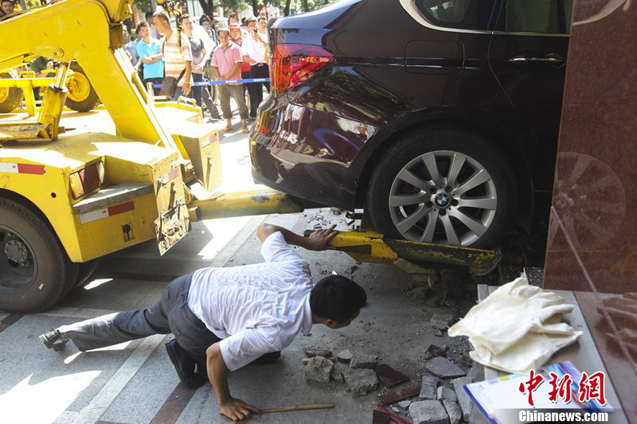 2013年6月26日,广东佛山,交通拯救车的工作人员正在小心翼翼地做好拖出宝马的准备。图片来源:CFP视觉中国