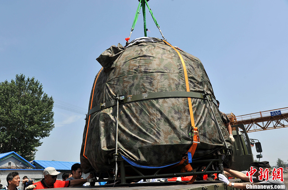 6月27日中午,经过20多个小时的公路和铁路运输,神舟十号飞船返回舱由内蒙古中部草原顺利运抵北京昌平火车站,“神十”任务主着陆场区指挥部正式向飞船研制单位中国空间技术研究院交接返回舱。图为工作人员将返回舱装车准备启运送回“娘家”——中国空间技术研究院。中新社发 孙自法 摄