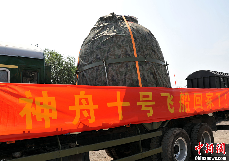 6月27日中午,经过20多个小时的公路和铁路运输,神舟十号飞船返回舱由内蒙古中部草原顺利运抵北京昌平火车站,“神十”任务主着陆场区指挥部正式向飞船研制单位中国空间技术研究院交接返回舱,飞船返回舱随后运送回“娘家”——中国空间技术研究院。中新社发 孙自法 摄