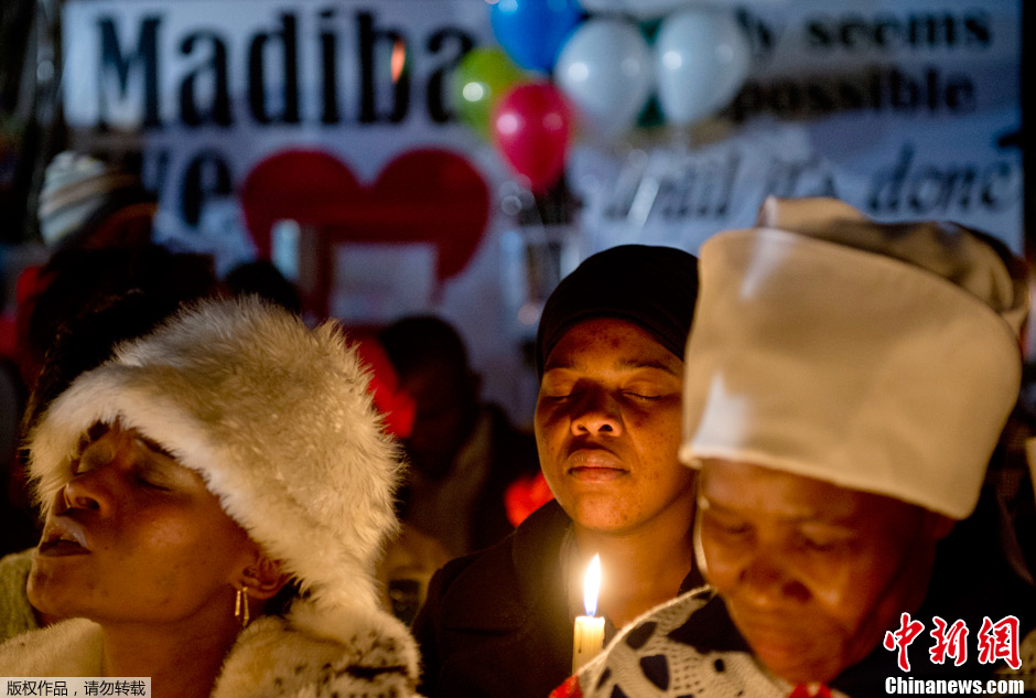 当地时间6月26日,南非比勒陀利亚,众多民众聚集在南非前总统曼德拉所住医院外,为其祈福。南非总统祖马26日说,南非前总统曼德拉的病情目前依然处于危急状态。本月8日凌晨,曼德拉因为肺部旧疾复发被送往医院。这是他自去年12月以来第四次住院接受治疗。