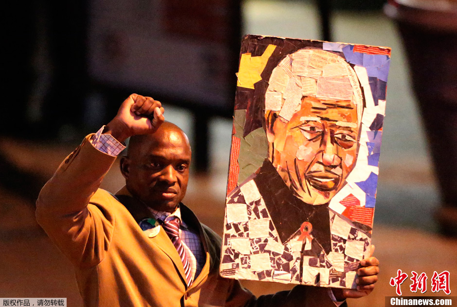当地时间6月26日,南非比勒陀利亚,一名男子在南非前总统曼德拉所住医院外,表达他对曼德拉的敬意和祝福。