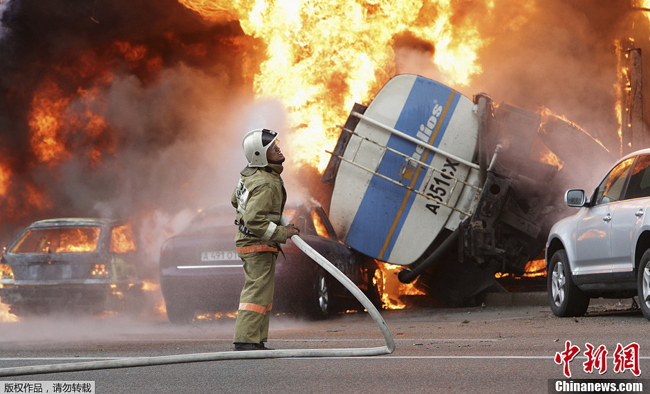 阿拉木图一油罐车侧翻起火 引燃临近建筑物