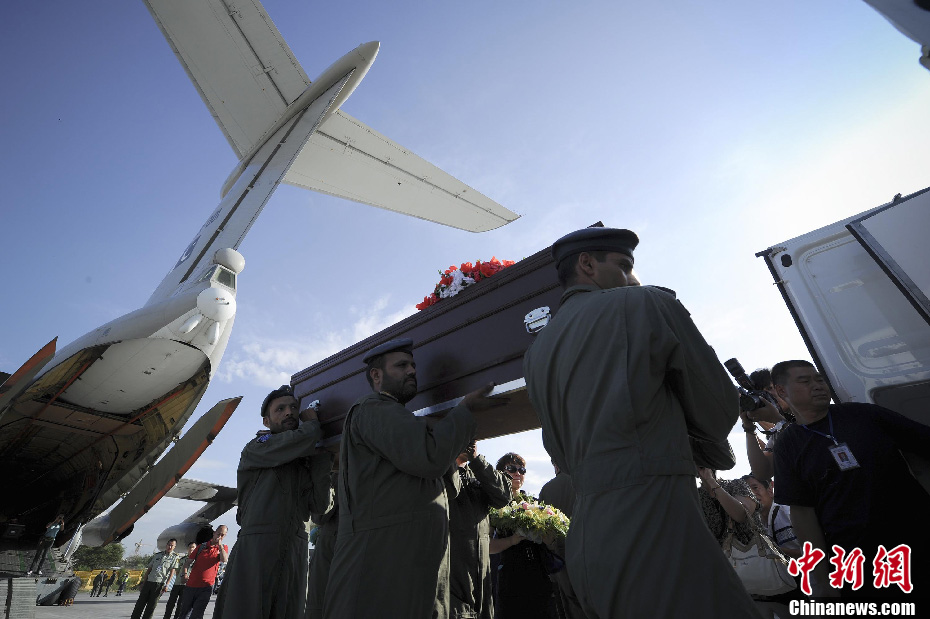 6月27日19时许,巴基斯坦军方运输机降落在新疆乌鲁木齐国际机场,23日在巴基斯坦南伽帕尔巴特峰营地遭遇一伙武装人员突然袭击身亡的民间登山家杨春风、饶剑锋遗体随机被运回中国。据介绍,杨春风的遗体已被运往乌鲁木齐市殡仪馆,巴军方运输机在乌鲁木齐国际机场加油后将飞往深圳,护送饶剑锋的遗体送回家。图为巴军方礼宾队护送杨春风遗体回国。中新社发 刘新 摄