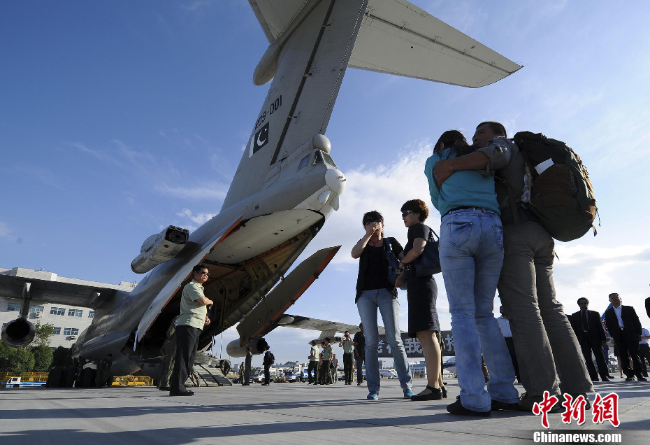 6月27日19时许,巴基斯坦军方运输机降落在新疆乌鲁木齐国际机场,23日在巴基斯坦南伽帕尔巴特峰营地遭遇一伙武装人员突然袭击身亡的民间登山家杨春风、饶剑锋遗体随机被运回中国。据介绍,杨春风的遗体已被运往乌鲁木齐市殡仪馆,巴军方运输机在乌鲁木齐国际机场加油后将飞往深圳,护送饶剑锋的遗体送回家。图为杨春风的家人及亲朋到机场迎接遇难者遗体,悲痛万分。中新社发 刘新 摄