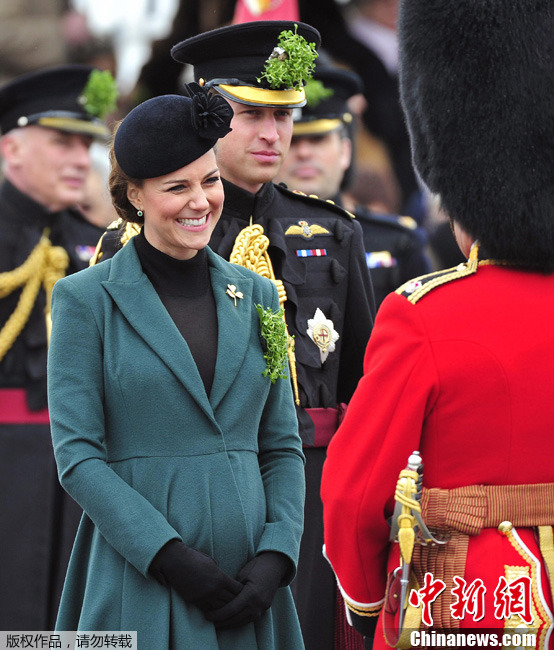 当地时间2013年3月17日,英国奥尔德肖特,威廉王子和凯特王妃视察爱尔兰卫队第一营,出席那里举行的圣帕特里克节游行。