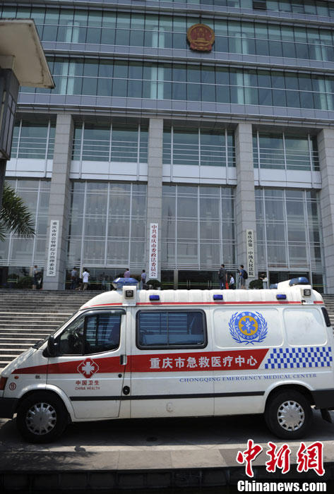 6月28日,重庆市急救医疗中心急救车停在法院外。当日,重庆市第一中级人民法院对雷政富受贿案一审公开宣判,以受贿罪判处雷政富有期徒刑13年,剥夺政治权利3年,对雷政富受贿赃款316万余元予以追缴,并处没收个人财产30万元。中新社发 陈超 摄