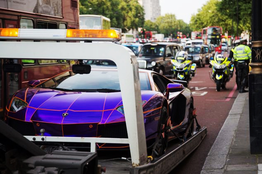 据英国《每日邮报》6月27日报道,当地时间26日,由于没有驾照或合格保险,驾驶兰博基尼埃文塔多的24岁卡塔尔统治家族成员阿勒萨尼,在伦敦布朗街头被警察扣留。早在三年前,该家族就因古怪的超级跑车而成为新闻头条。这辆斥资35万英镑(约合人民币328万元)、由日本调优公司个性定制的兰博基尼埃文塔多是世界上最快的跑车之一,6.5升的V12引擎使其最高速度能达到每小时217英里(约合349千米)。仿佛出自科幻电影般的荧光紫色车身令人惊叹。这一招摇抢眼的剪刀门跑车瞬间吸引了大批路人驻足围观。当低货架挂车抵达时,一名警察缓慢地将它开上挂车后部。图片来源:环球网