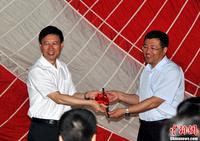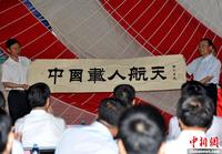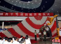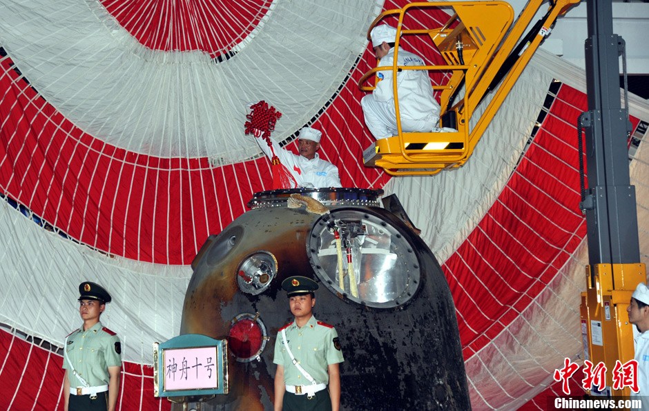 6月28日下午,中国载人航天工程办公室和中国航天科技集团公司,在北京航天城内神舟飞船“娘家”——中国空间技术研究院举行神舟十号返回舱开舱仪式。图为工作人员从舱内取出并展示由“神十”航天员带回地面的天宫一号内饰物“中国结”。孙自法 摄